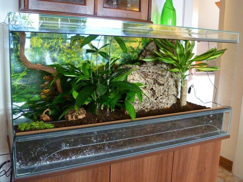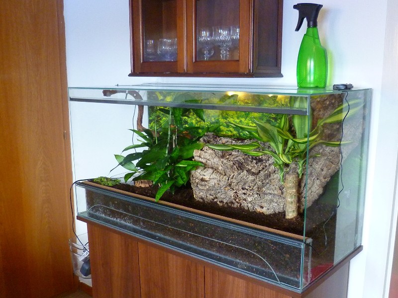 Im Terrarium befinden sich ein Wasserbecken mit Moorkienwurzel und Filter sowie eine riesige Korkröhre. Die musste ich zurechtsägen, damit sie überhaupt ins Terrarium passt; der Außendurchmesser beträgt etwa 30 cm. Ich hatte nach einer möglichst großen Körkröhre gesucht, damit die Ovumse nicht stecken bleiben, wenn sie mal größer werden. Der einzige Nachteil an der Größe der Korkröhre (und der Pflanzen) ist, dass das Terrarium um sie herum im Verhältnis irgendwie klein aussieht