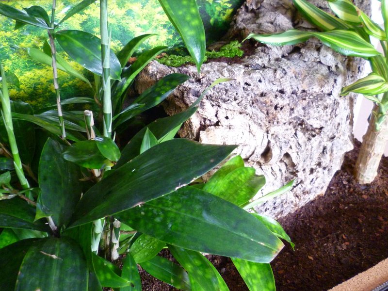 Dracaena surculosa zu kaufen, bin ich sehr glücklich. Die Pflanze hat wunderbar ausladende Äste und Blätter, nimmt dabei aber wenig Bodenfläche ein. So können die Schnecken einen großen Teil des Terrarienbodens bekriechen und durchwühlen und sind dabei trotzdem unter dem Blätterdach versteckt. Dadurch werden sie für mich natürlich etwas schwieriger zu sehen sein, aber ich denke, dass die Schnecken solche versteckten Bereiche bevorzugen.