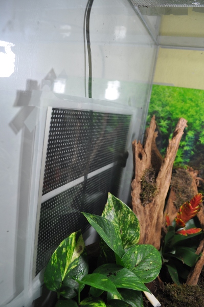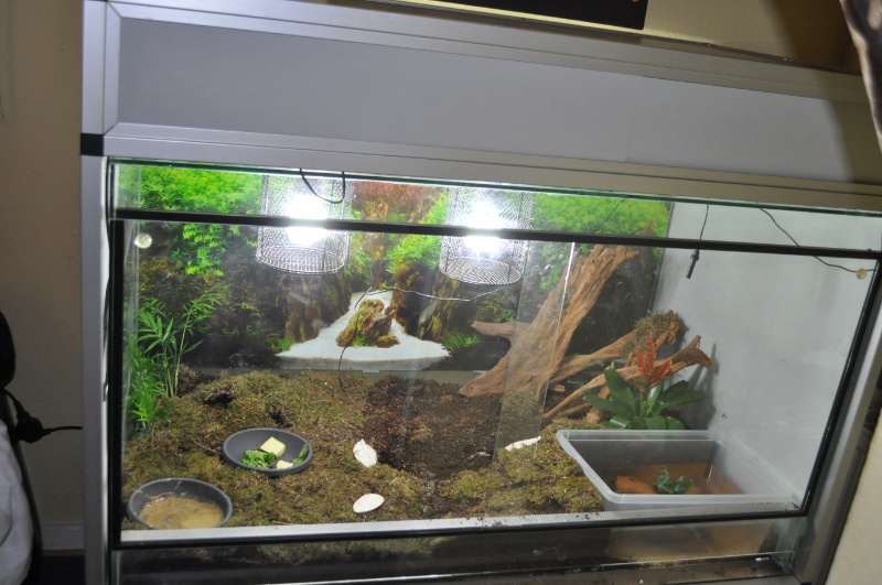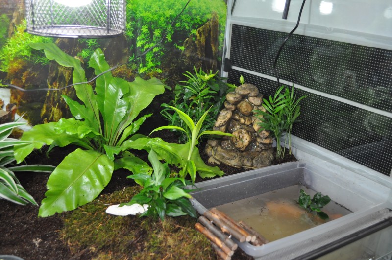 eeeendlich gab es ein großes Upgrade im Terra. Der verdammte Humus kam mit unendlicher Verspätung die Tage an, die Tageslichtbirnen und ein Brunnen kamen heute einen Tag zu früh - Juhu. Auf eine getrocknete Weinrebe und 2 Korkröhren warte ich allerdings noch. Ebenso auf die Abdeckung wo die Birnen reinkommen. Aber ich hab ja so oder so 2 Fassungen drin, also habe ich sie solange daran geschraubt. Zu der 20watt Heizmatte gesellt sich nun eine 35w Heizmatte. Plus Beleuchtung ( final 4 Birnen) hoffe ich, dass ich nicht mehr über die Raumtemperatur regulieren muss. Ich habe 2 Stunden nonstop Pflanzengeffummel hinter mir und bei Schneckentemperatur macht das keinen Spaß. Zumal ich eh keinen Grünen Daumen habe