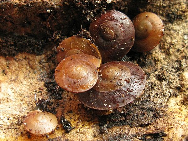 Die "Großen" sind jetzt knapp 2cm groß, so groß, wie ihre Eltern waren, als sie bei mir einzogen. Sie werden langsam blickdicht. Die drei, die ich anfangs zu feucht hielt, sind im Häuschen anfangs etwas hubbeliger gewachsen als die Tiere aus dem nachfolgenden Gelege. Seit sie trockener wohnen, werden die Umgänge weniger gewölbt gebaut.