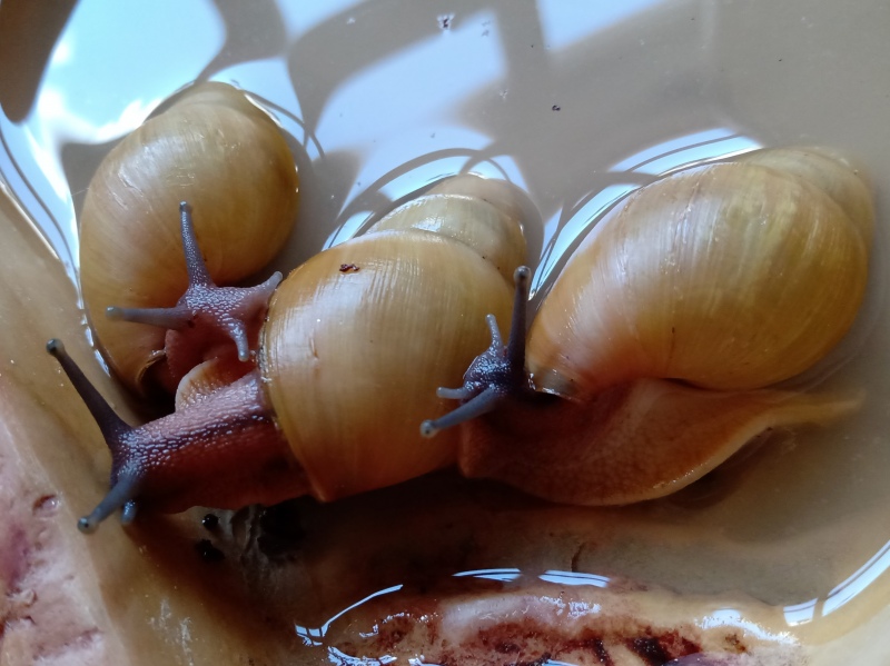 Drei neugierige Archachatina porphyrostoma mit albinotischem Haus.