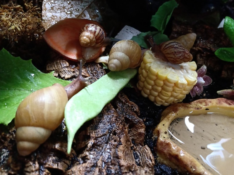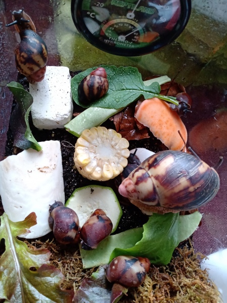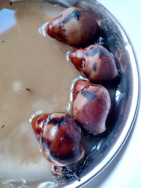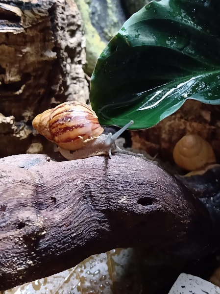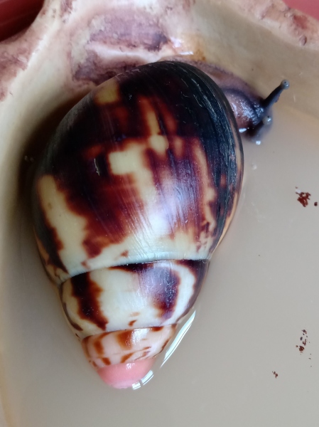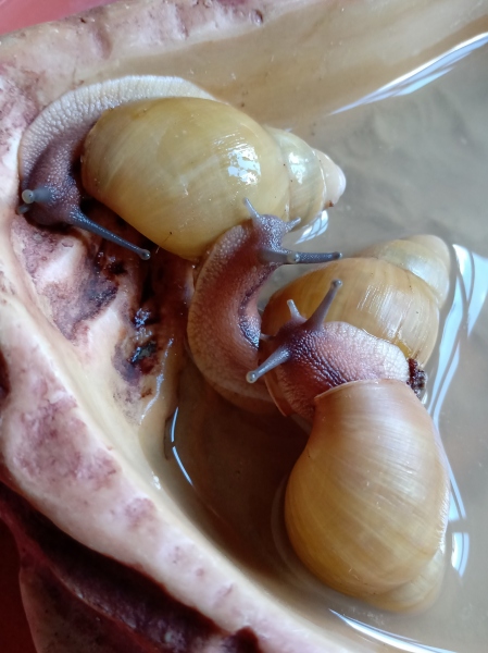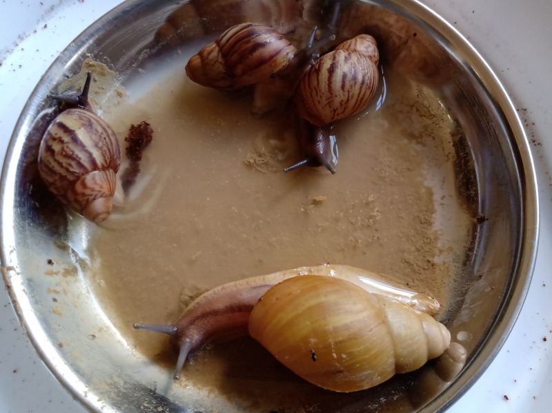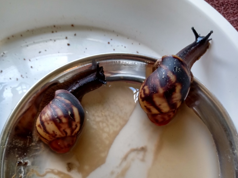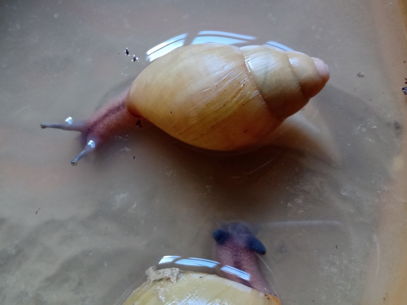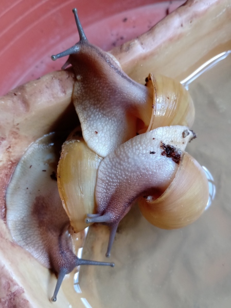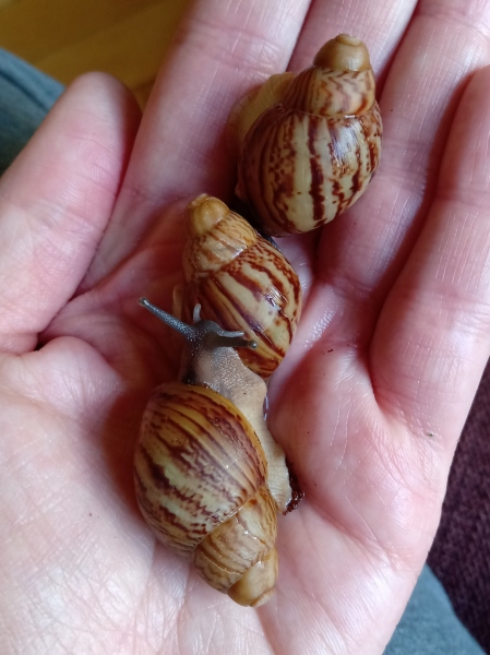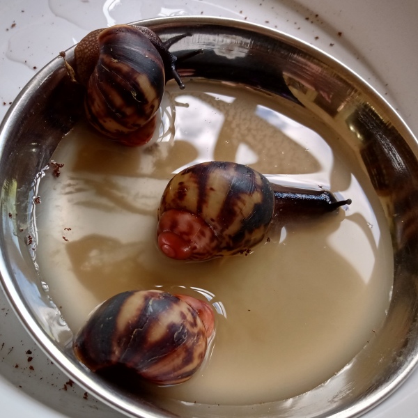 Darin waren zwei neue Archachatina-Arten in jeweils zwei Farbformen. Die Kleinen haben ihre Reise gut überstanden und leben sich jetzt ein. Wenn ich Schnecken mit der Post bekomme, biete ich ihnen nach ihrer Ankunft zuerst ein Heilerdebad an, was bisher von den meisten auch gerne angenommen wurde.
