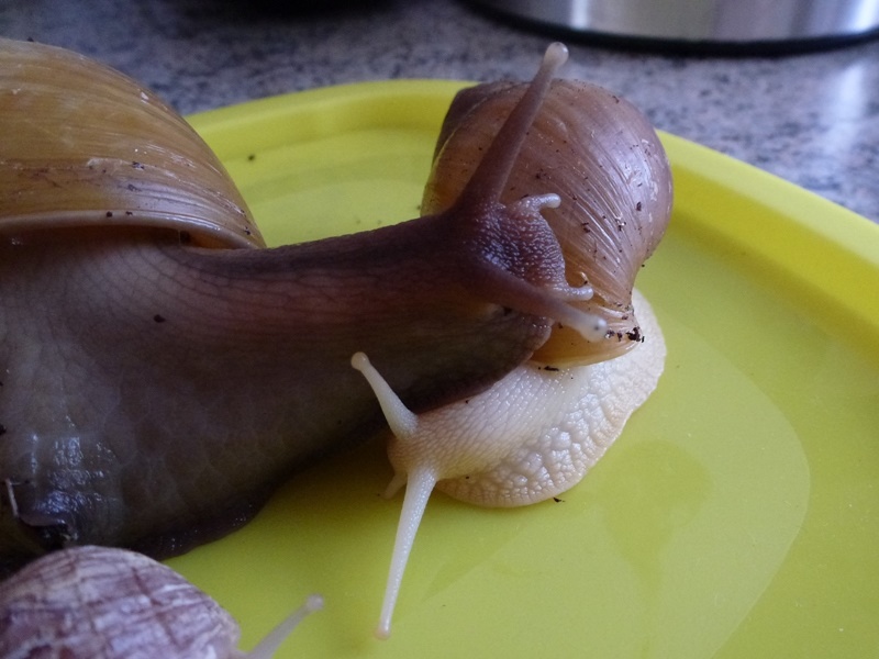Nun das beste: Ich habe schon so oft Anfragen auf Nachzuchten von den Italienern bekommen, bisher sind mir aber zwei Gelege komplett gestorben und danach kam die lange Ruhepause der Schnecken. Es ist wirklich schwer, es ihnen gerecht zu machen, wenn man nichts über deren Lebensweise und Zyklus mit Paarungszeit und Ruhephase weiß. Nun konnte ich eine Paarung beobachten! Hoffe also bald auf Nachwuchs. Wenn der stabil bleibt, kann ich vielleicht ein paar der Marmoranas vermitteln