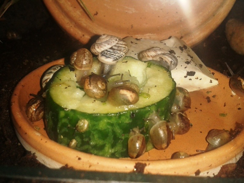 Marmorana Muralis sich etwa zwei Monate überhaupt nicht gerührt hatten, also einfach nur an der Glaswand hingen, war ich total glücklich, als sie nach dem letzten Putz quasi alle gleichzeitig aus ihrem Schlaf erwacht sind. Vielleicht motiviert durch die etwa 20 Cornu- und Weinbergnachzuchten, die den Winter über mit im Becken leben? Nunja, jedenfalls konnte ich letzte Woche diese beiden Gemeinschafts-Fressbilder aufnehmen, ein seltener Anblick bei den Marmoranas^^