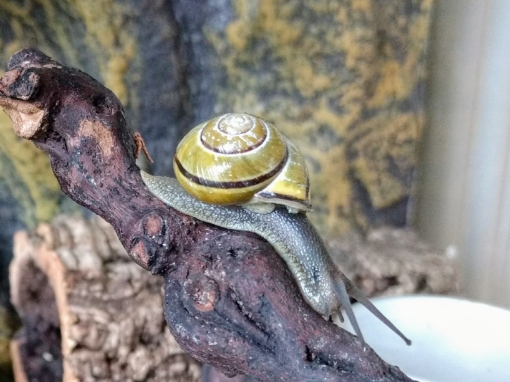 Meine Tochter hat mir gestern vom Schulausflug eine wunderschöne Hainbänderschnecke mitgebracht. Da das Kerlchen, sie hat es Alberto genannt, zunächst sehr lethargisch war, musste es über nach in einem separaten Behältnis bleiben.