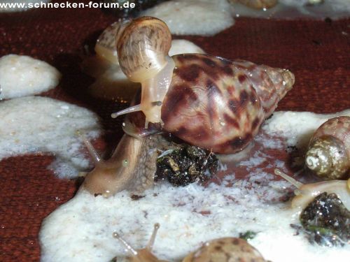 Im Gesicht haben sie graue Flecken, der Körper ist ansonsten aber braun. Die Häuschen sind in sehr schlechtem Zustand und rau. Teilweise sind rosa Linien darin, ich hoffe, das kann man einigermaßen sehen.