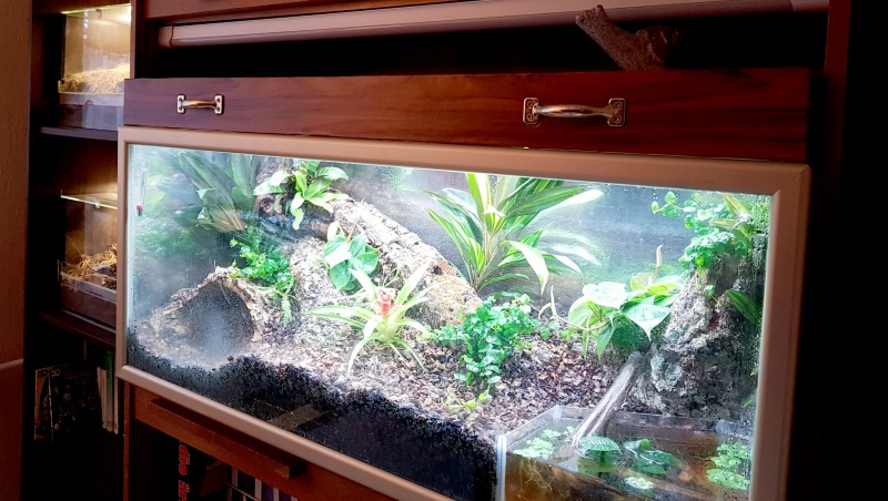 Bei der Einrichtung habe ich mich an der Machart meines damaligen Sutu-Beckens orientiert: Ganz unten ist eine dünne Schicht Lavagranulat als Drainage, obendrauf der Bodengrund bestehend aus Pinienrinde und Korkgranulat, natürlich alles gut aufgekalkt. Die Pflanzen sind wieder in Nylonsöckchen gesetzt, mit Seramis aufgefüllt und in den Bodengrund gepflanzt. Eine Besonderheit gibt es jedoch noch: Nachdem ich in Wassns Galerie gesehen habe wie gern Ovums baden und sogar tauchen hat das Becken auch einen Swimming-Pool bekommen