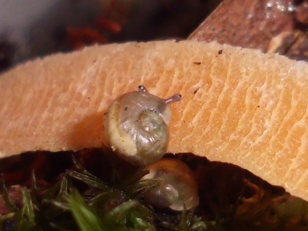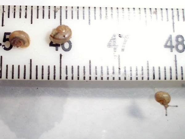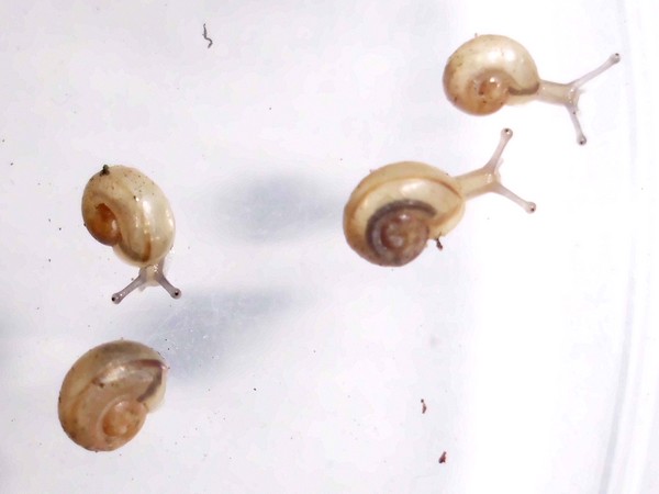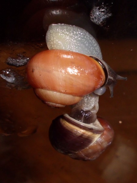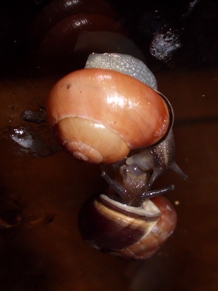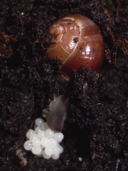 So, jetzt war es soweit, ich habe mal nachgeschaut, wo Rotschöpfchen abgeblieben ist. Also alle Zweige und Borkenstücke entfernen, Moos rausnehmen... Die beiden großen Zugedeckelten waren in ihren Ecken. In der Mitte dann das Gelege, das ich nun rausgeholt habe (rund 90 Eier). Wo aber steckt Rotschöpfchen? Blieb mir nur übrig, ganz vorsichtig Erdarbeiten vorzunehmen, und schließlich fand ich sie in einer Ecke eingegraben. Danach habe ich wieder alles eingeräumt, und kurz darauf wunderte ich mich, dass plötzlich drei Schnecken sichtbar waren: Rotschöpfchen fand wohl, dass sie nach der Störung mal nach dem Rechten schauen müsste.