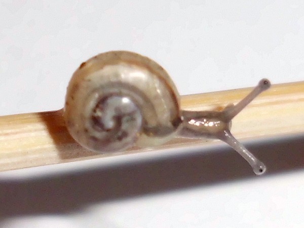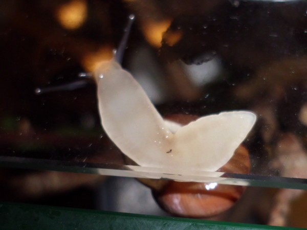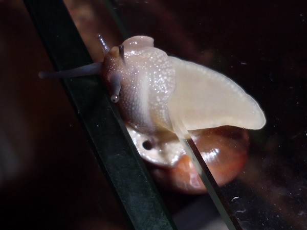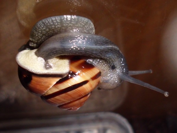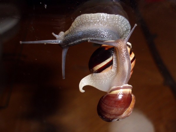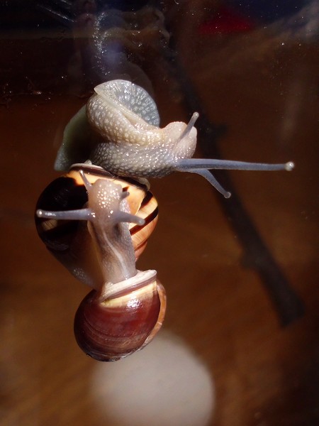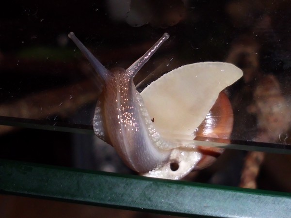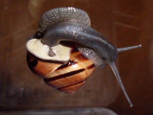 Oh Mann, hier wird ja das Unterste zu oberst gekehrt. Nix wie weg hier...Natürlich wollte er nicht wieder rein, aber schließlich konnte ich ihn austricksen, indem ich ihm einfach die Glasabdeckung in den Weg hielt, wo er dann leichtsinnigerweise raufkroch. Dann war es ganz einfach: Schneck am Deckel, Deckel so auflegen, dass Schneck sich drinnen befindet, fertig.