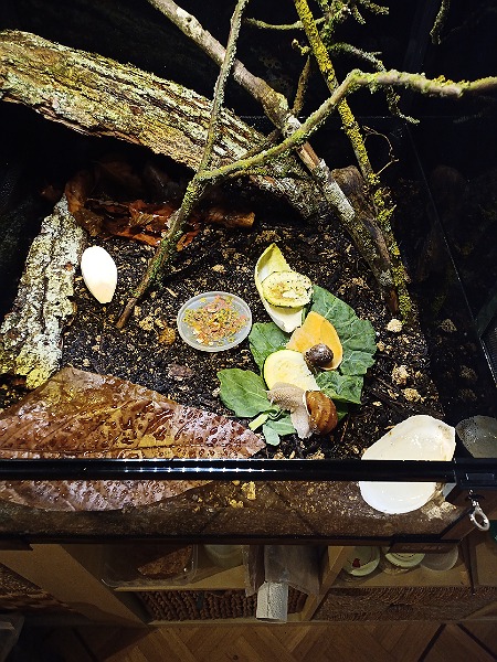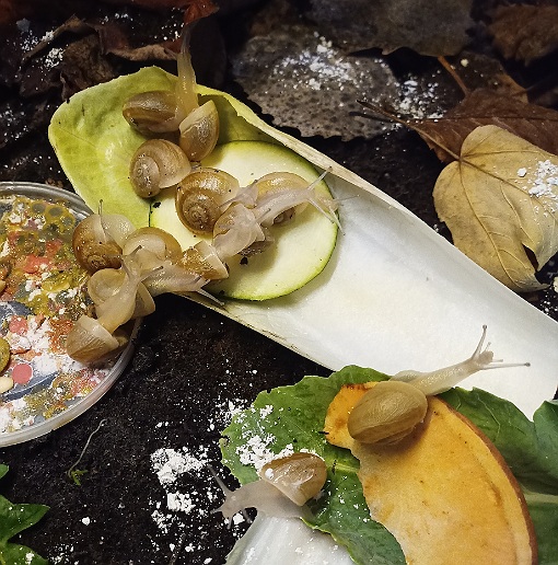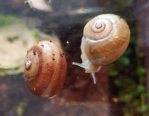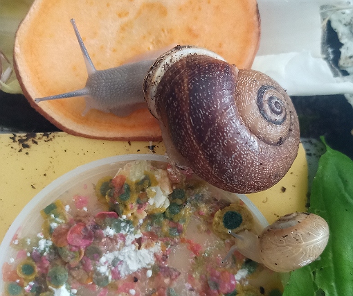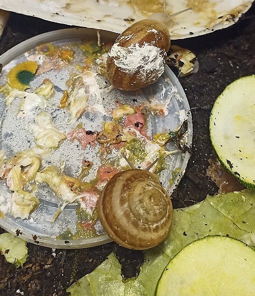Die Gewächshausschnegel haben sich leider so explosionsartig vermehrt daß ich da massiv einschreiten mußte, super schade weil meine zwei recht blaß gezeichneten Alttiere da ein paar wunderschöne, kräftig braun getigerte Nachkommen hatten. Das Zusammenleben mit den Schnegeln war mit allen anderen Tieren völlig problemlos und ich bin eigentlich echt traurig daß es einfach wegen der vielen Nachkommen nicht klappt. Ich habe immer wieder genau geschaut wie die Schneckenarten untereinander reagieren, ganz oft kam es vor daß Schnegel und Otala Kopf an Kopf am gleichen Futter nagten. Bei Begegnungen waren es immer die Schnegel, die ganz höflich Platz gemacht haben.