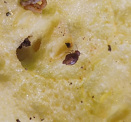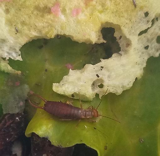 In der großen Box sind Kurzflügler aufgetaucht und ziemlich gleichzeitig habe ich immer weniger von den roten Springschwänzen gesehen. Ich hatte schon üble Sorgen um die süßen Kobolde, aber die hatten sich nur tief in den Boden zurückgezogen und sind nun auch wieder häufiger. Zudem sehe ich die Kurzflügler und ihre Larven auch immer nur am Gemüse und den Fischflocken futtern, ich hoffe mal daß es also keine der räuberischen Arten ist.