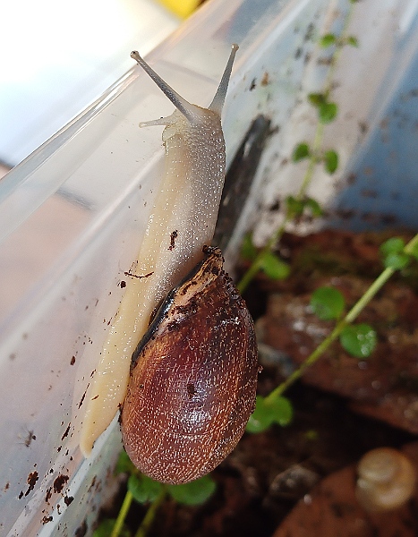 Die beiden Weinis durften mit Beginn der Regenfälle wieder in die Freiheit, das gerettete Findelkind hat sich von Daumennagelgröße zu einer wirklich prächtigen Schnecke entwickelt.