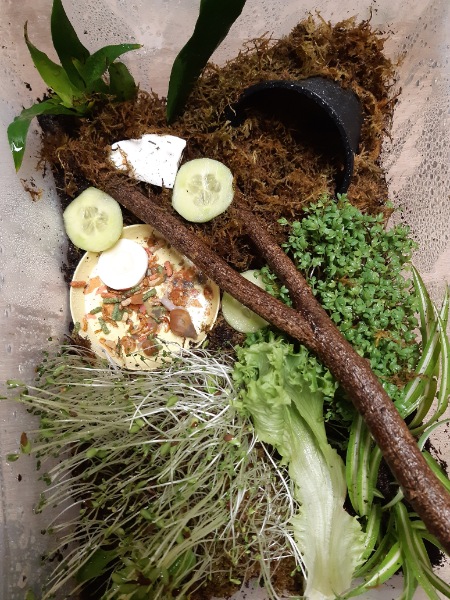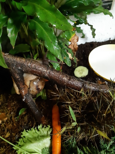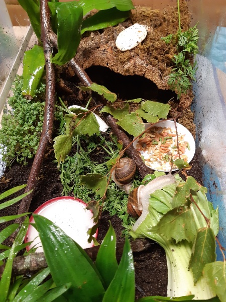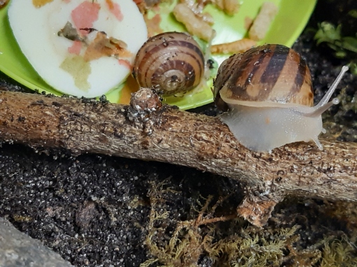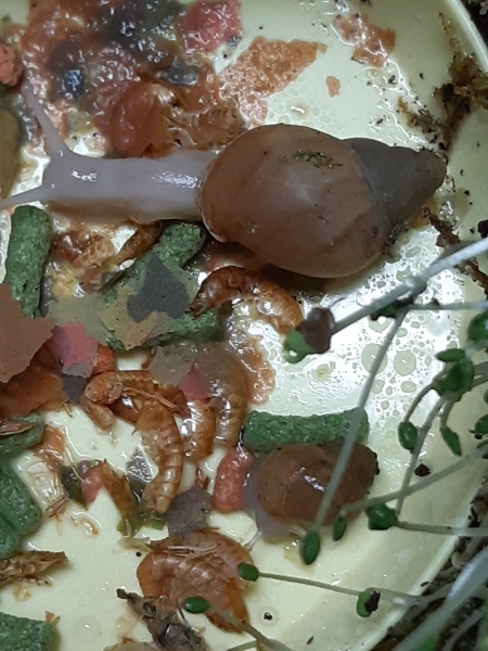 Nee, im Ernst. Sie bekommen viel Futter. Eigentlich viel zu viel... Kalk in Form von selbstgemachten Kalkblock in Stückchen und Sepiaschale in Stücken. Gelegentlich streu ich etwas Sepiapulver übers Futter. Natürlich auch mal Gammarus und Achatinasticks