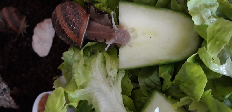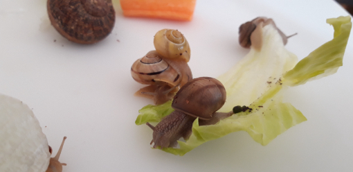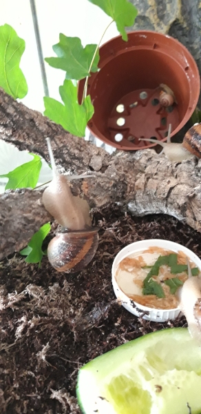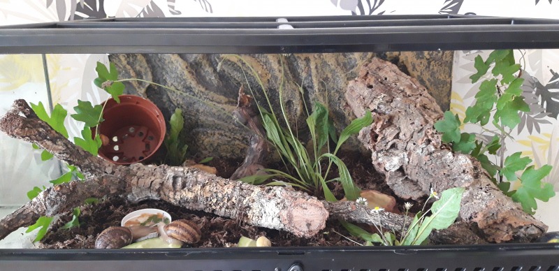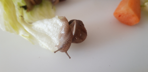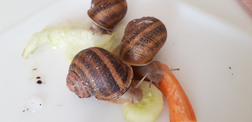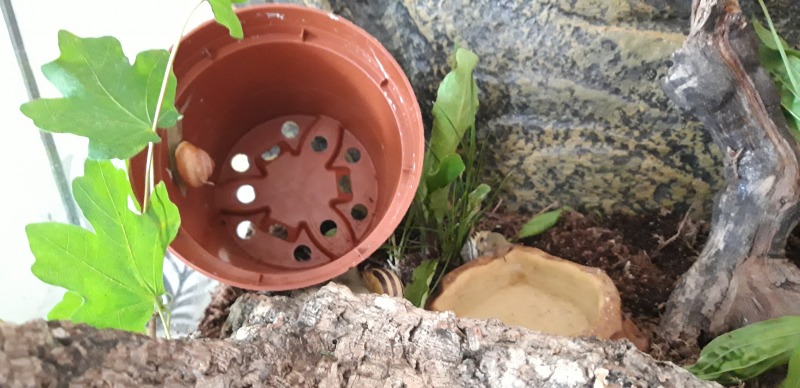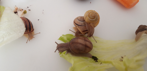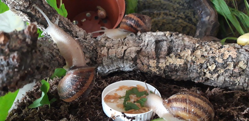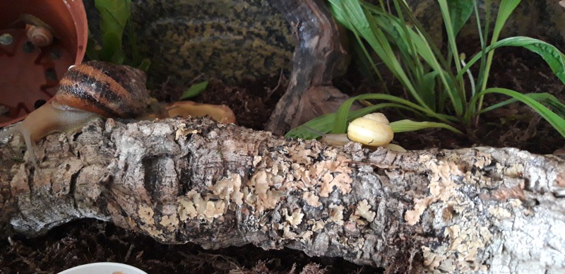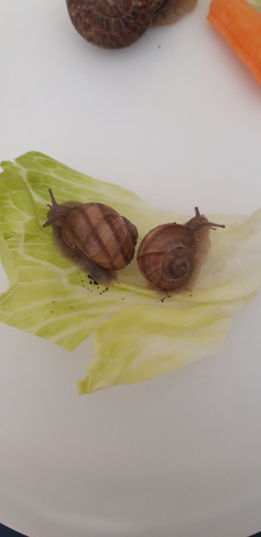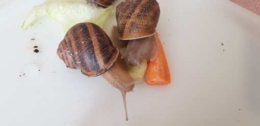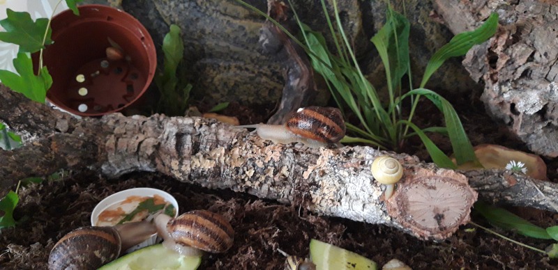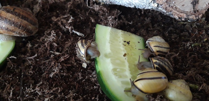 Im Moment habe ich 6 Cornu aspersum maximum in einem 60×45×30 Terra und 5 Cepaea nemoralis und hortensis (Bänderschnecken) mit zwei Weinbergschnecken-Jungtieren vorübergehend in einem 30×30×30