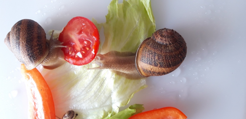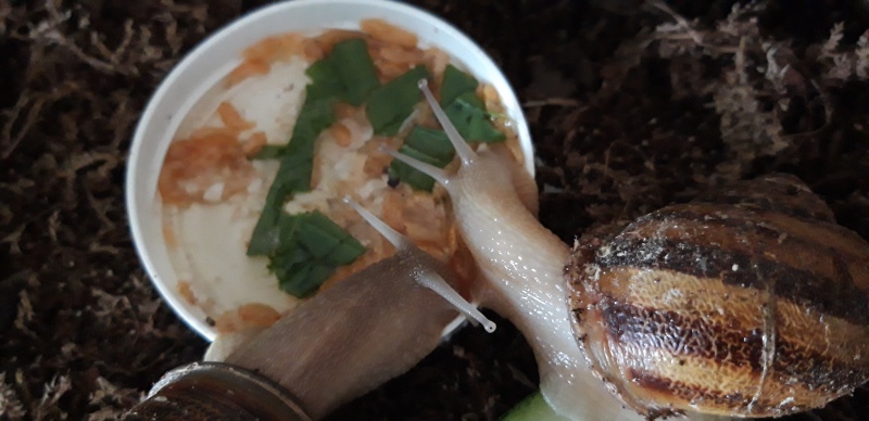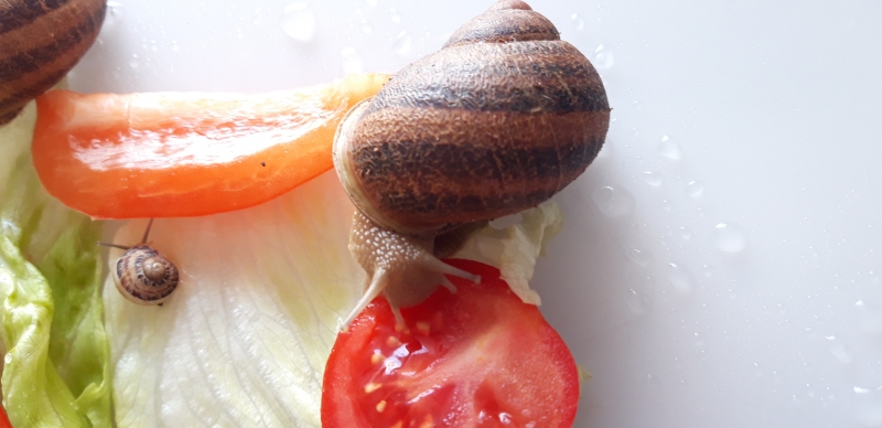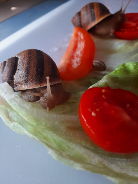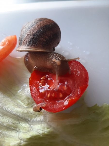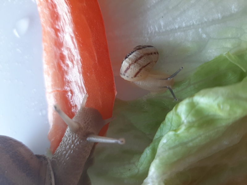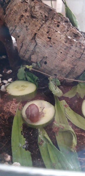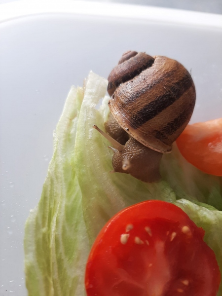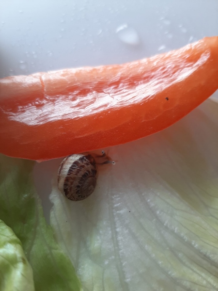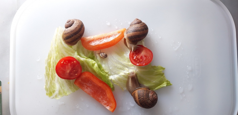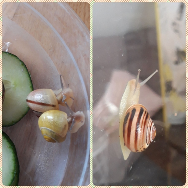 Im Moment habe ich 6 Cornu aspersum maximum in einem 60×45×30 Terra und 5 Cepaea nemoralis und hortensis (Bänderschnecken) mit zwei Weinbergschnecken-Jungtieren vorübergehend in einem 30×30×30