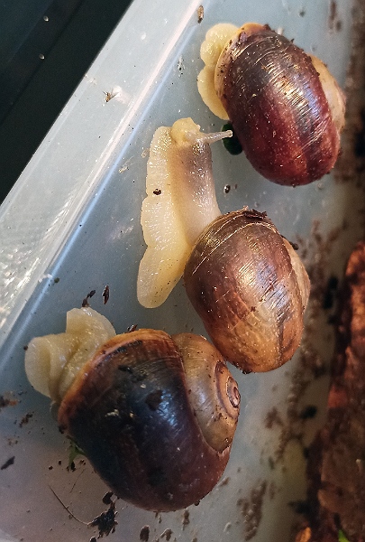 Bei Otalas und Nudeln haben sich die Häuschen prima stabilisiert, es gab auch keine weiteren Sturzschäden. Bei den Nudeln ist es interessant - alle dunklen Exemplare haben schon lange die abschließende Mündungslippe gebildet, alle hellen Exemplare sind bei gleicher Größe noch nicht fertig mit dem Wachstum.