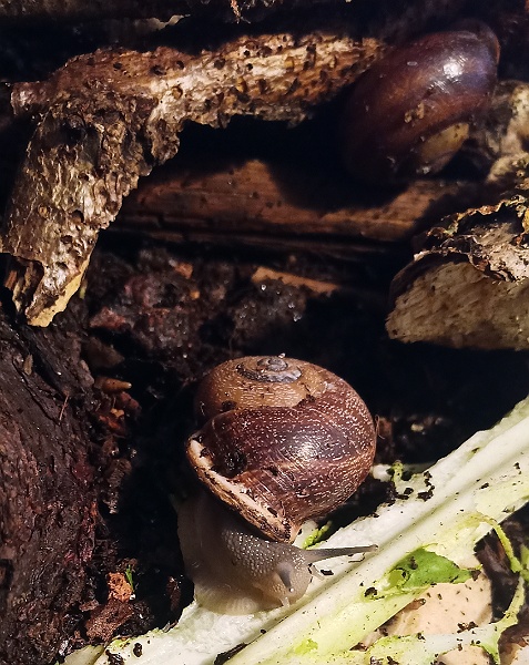 Sie war ein Beifang in der gekauften Walderde, kam als ganz kleines Schneggle hier an und ist inzwischen ordentlich gewachsen. Sie ist immer wieder mal zu sehen, auch mal morgens, ist extrem gemütlich unterwegs und liebt ihre Badeschale. Sie unterscheidet sich aber deutlich von den anderen gelben Exemplaren, es müssen wirklich zwei verschiedene Arten sein.