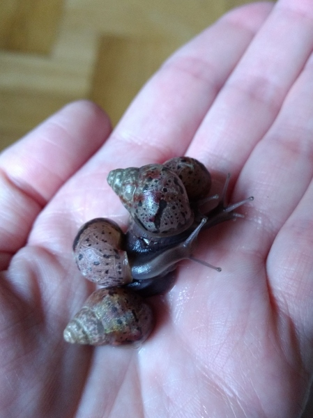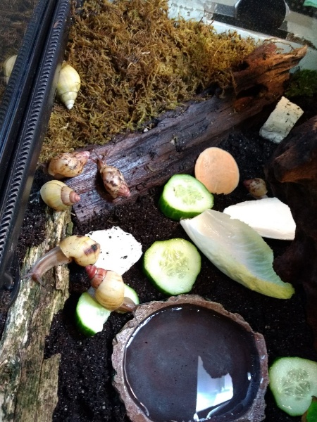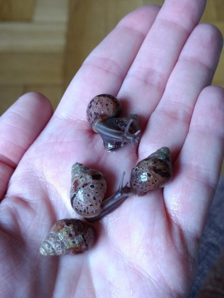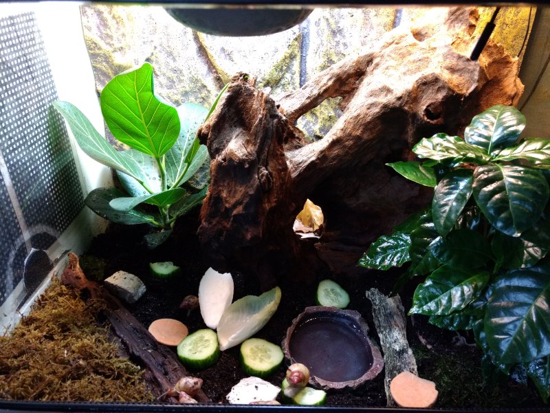 Da sich einzelne meiner Bänderschnecken in den vergangenen Wochen immer mal wieder verdeckelt haben, versuche ich, sie auf einen Winterschlaf einzustimmen. Sie sind in eine große Faunabox umgezogen, die momentan bei uns im unbeheizten Wintergarten steht. Ich bemühe mich, sie wenig zu stören und gebe nur noch alle 2-3 Tage frisches Futter hinein und sprühe kurz. Einige sind noch wach.