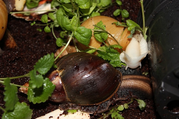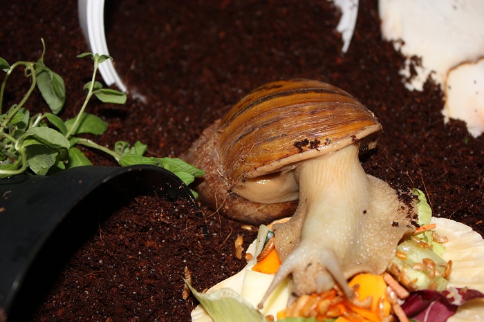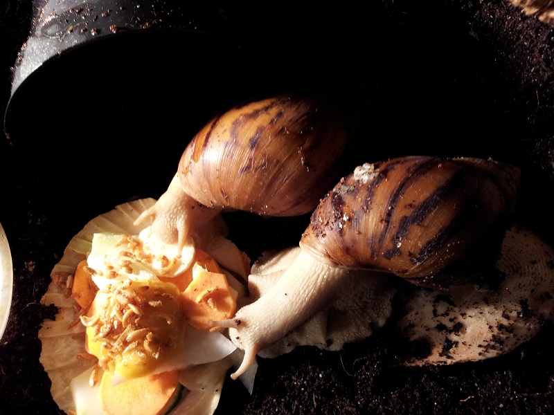 Gibt es ja gar nicht! Nachdem ich sie lange Zeit auf der Hand hatte und die Schnecke jeden Millimeter meiner Haut inspiziert hat, habe ich die Hand flach auf die Erde gelegt, um sie runterkriechen zu lassen. Und was macht sie? Rennt in Richtung Napf und schlägt sich die Wampe voll!! Huch!?