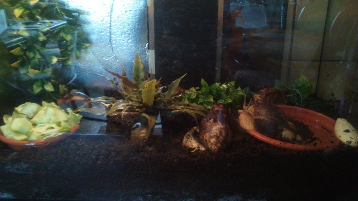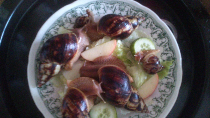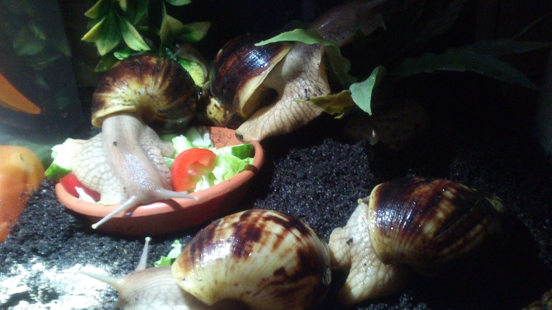 Bei meiner abendlichen Fütterung. Meine essen am liebsten Eisberg und Gurken. Über Frischen Löwenzahn aus dem Garten freuen sich alle am meisten. Der ist im nu weggeputzt.