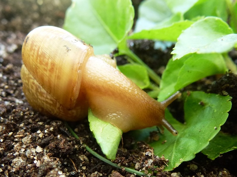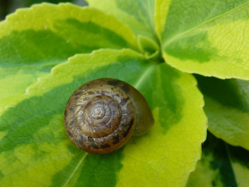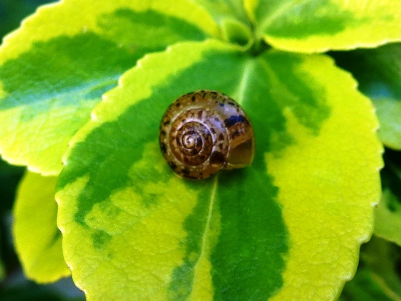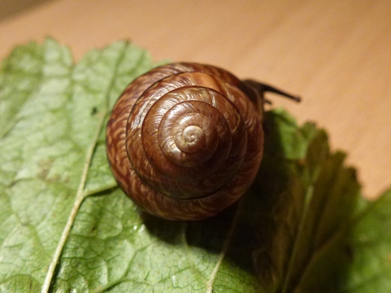 Darf ich vorstellen: Eine spitze Baumschnecke! Sie saß neben all den anderen Baumschnecken. Ich hoffe nun sehr, dass diese offenbar mutierte Gehäuseform genetisch vererbbar ist.