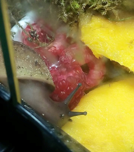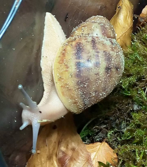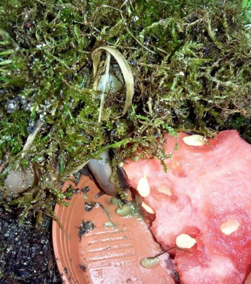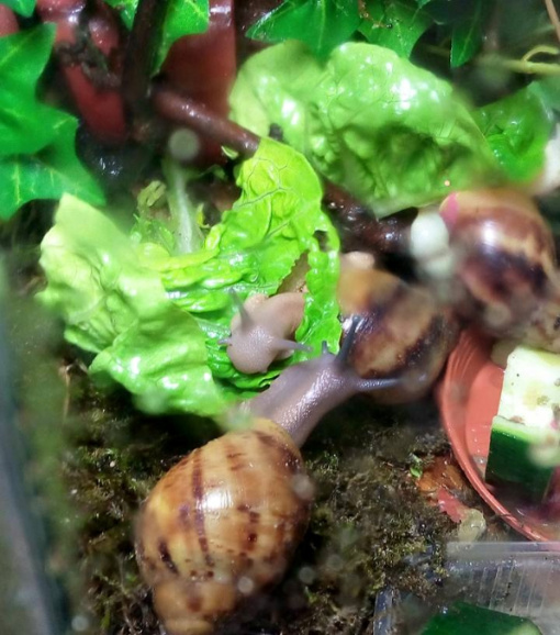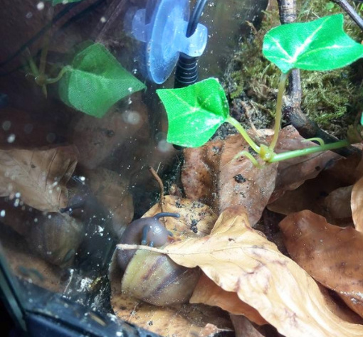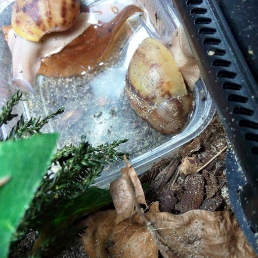 Ich habe nach einiger Zeit wieder angefangen Schnecken aufzunehmen. Drei sind bereits da, andere folgen noch. Ich habe endlich das Terra auf 27 ,2 Grad bekommen und die ouvums fühlen sich wohl. Sie schlafen viel, aber spät Abends und früh Morgens sehe ich sie immer fressen. Die Kompostwürmer fressen auch fleissig und haben sich unter dem Moos eine Bleibe gesucht. Ich seh einige kleine "Gänge" an der Scheibe und ab und an auch einen Wurm. Mein kleiner Sohn will immer Schnecken gucken. Er ist hin und weg. :grinz: