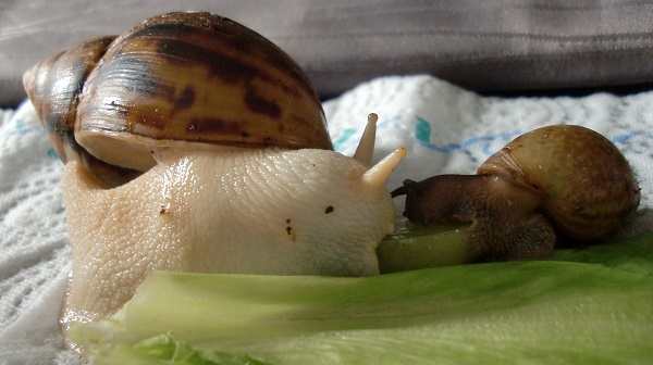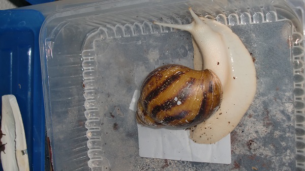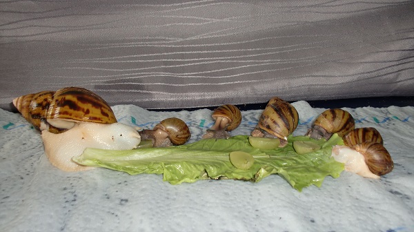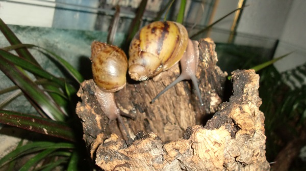 Der werte Herr hatte eine Heimchendose in der Hand, darin zwei Schnecken. Belesen wie ich war, erklärte ich ihm, dass es Achatina fulica waren. Tja, so schnell gings dann. Eine kostenlose Heimchendose voll Schneck...