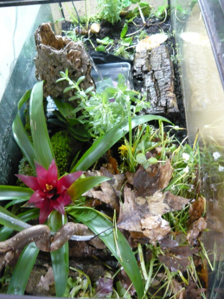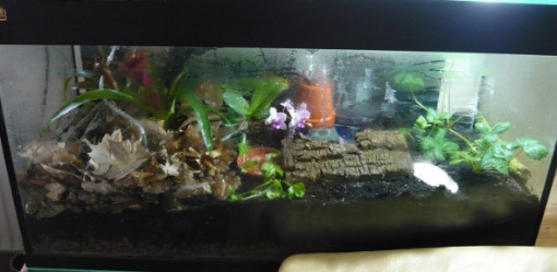 Ganz unten habe ich eine dünne Schicht Aquariensand, dann eine Schicht Pflanzton (als Drainage!) und schließlich sehr viel Erde.