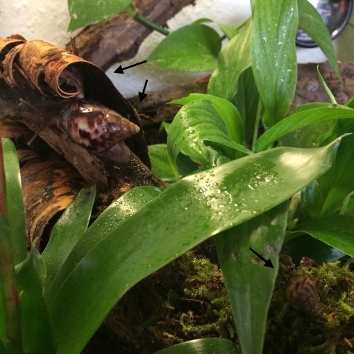 Sie wachsen und gedeihen prächtig. Bisher hatte ich sie in einer Faunabox. Nun durften sie umziehen. Das Einrichten des Terrariums hat mir riesige Freude gemacht. Im Wald habe ich rumliegende Äste, Rinde, Laub und Moos eingesammelt. Als Bodenuntergrund habe ich lehmige Walderde, Kokoshumus und Komposterde gemischt (natürlich auch Kalk). Moos, Laubblätter, Äste, Rinde und Pflanzen (im Topf in der Erde) bieten viele Versteckmöglichkeiten. Evtl. lasse ich nun noch Plexiglas zuschneiden um ein Teil des oberen Gaze-Deckel abzudecken damit ich die Luftfeuchtigkeit besser halten kann. Durch die Pflanzen und das tägliche Sprühen geht es momentan noch ganz gut. Ich finde dass sie ein sehr natürliches und gemütliches Schneckenzuhause haben. Und es riecht sooooo herrlich nach Wald!