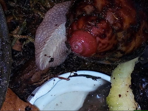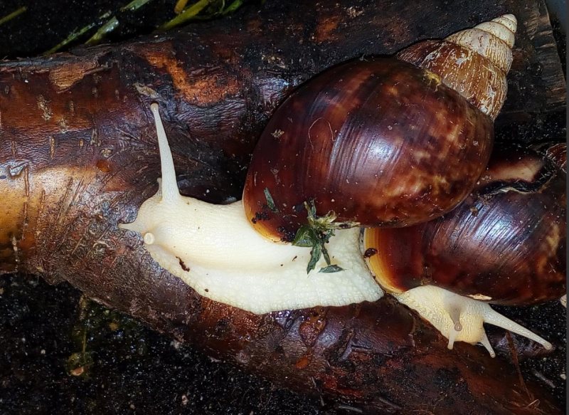 Als Jungtiere schlafen sie gerne oben hängend, wenn sie größer sind , eher leicht verbuttelt in der Gruppe in Mulden oder auch gerne unter Blättern. Bei ihnen habe ich wie bei Achatina achatina große getrocknete Kakaoblätter aus dem Terraristikhandel, unter der sie sich gut verstecken können.