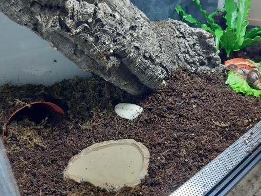 Inzwischen habe ich das Moos in der Ecke ein bisschen aufgestockt und noch eine zweite Sepiaschale dazugelegt. Die erste ist fast abgeraspelt :) Im Hintergrund ist die Heizmatte, das Stück Holz dahinter klemmt de Matte zwischen Wand und Terrarium ein, damit mir nicht so viel Wärme verloren geht.