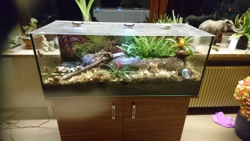 Hier mal Bilder von meinem Terrarium....derzeit halte ich Axhatschnecken Achatina fulica , Weinbergschnecken und Bänderschnecken. Ich bin dabei auch noch ein zweites,. kleines Terrarium einzurichten um möglicherweise Schnecken zu trennen. Derzeit achte ich darauf Schnecken zu bekommen die ich z.b bei 21 Grad vertretbar halten kann. Ich habe natürlich eine Heizmatte mit Styropor als Dämmung an der Rückwand- hier dürfte es auch wärmer sein, aber ich möchte mich auf leichter zu haltende Arten konzentrieren und es gibt hier ne Menge...ein Hobby bei mir das gerade erst richtig anfängt.