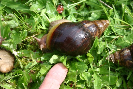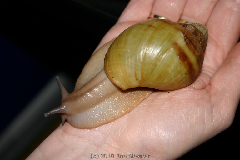 Hier mal ein Größenvergleich mit meiner Achatina achatina, deren Gehäuselänge zur Zeit 16 cm beträgt