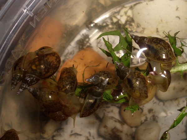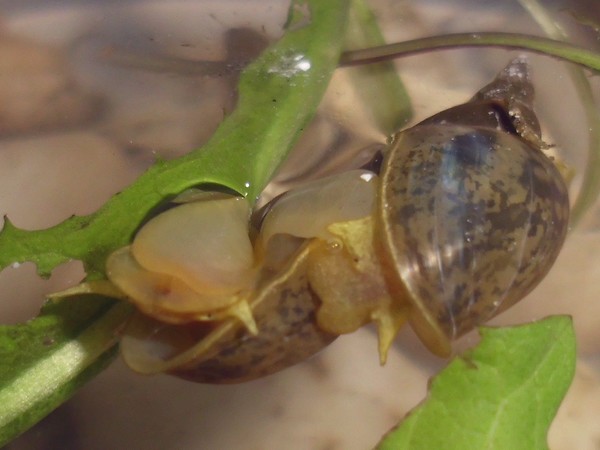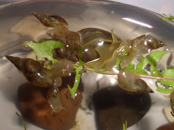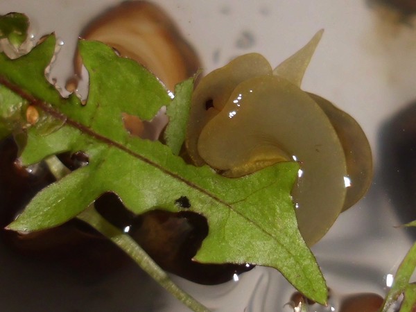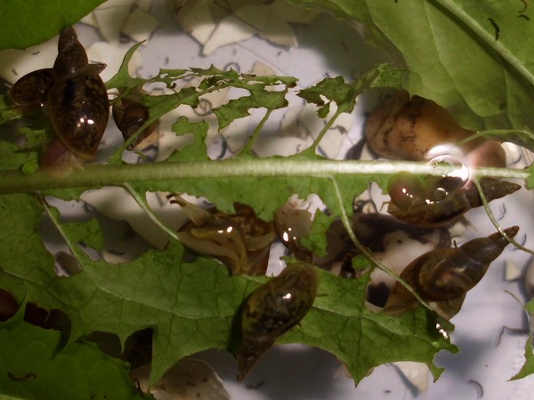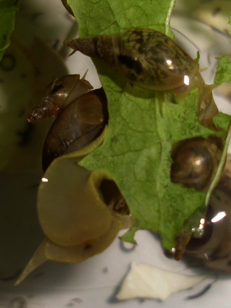 es ist nun ja schon ein Monat seit dem letzten Beitrag vergangen... Inzwischen habe ich schon einen Teil der Schnecken in den Teichen der Sequoiafarm ausgewildert, na ja, nicht selbst, da war am Ende zu wenig Zeit, aber jedenfalls das Eimerchen übergeben. Der Rest ist immer noch bei mir, und einige sind schon recht gut gewachsen. Heute musste ich unbedingt wieder Nachschub an Löwenzahnblättern holen, die zarten jungen, dabei stellte ich fest, dass ich die Versorgung mit Futter mit einer Umsiedelung verbinden sollte. Das Wasser in einem Gefäß war etwas trüb, das hatte ich nicht so im Blick.