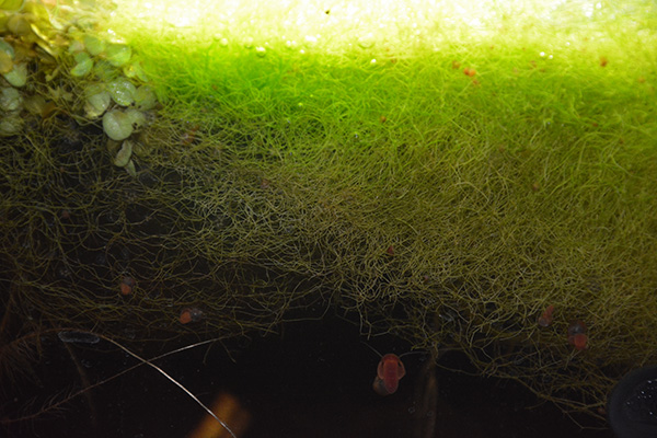Alles begann damit, dass wir für den Aquariumgrund etwas Gras wollten. Das haben wir dann eingesetzt. Leider hat es den Schnecken wohl zu gut geschmeckt und so haben sie es rausgerupft und zum großen Teil aufgefressen. Ein paar wenige Grashalme trieben oben zwischen den Schwimmpflanzen auf dem Wasser herum. Die haben wir dort einfach gelassen und uns nichts dabei gedacht. Als wir eines Tages vom Urlaub wieder kamen wunderten wir uns sehr. Es hatte sich bereits ein kleiner Teppich an der Wasseroberfläche gebildet in dem sich Schnecken befanden.