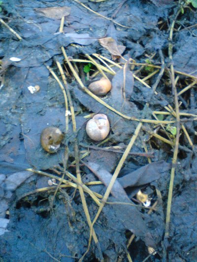 An einer anderen Stelle wo sich das Wasser schon zurückgezogen hatte war es auch nicht besser... haufenweise kleine Schnecken, ich glaube es sind Baumschnecken, wurden an die oberfläche geschwemmt.