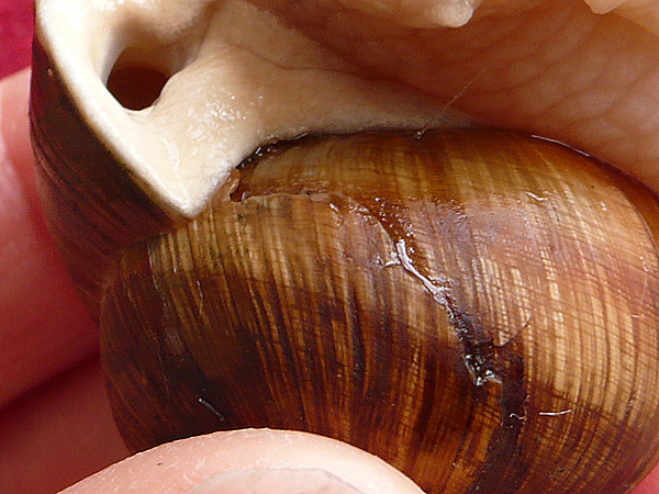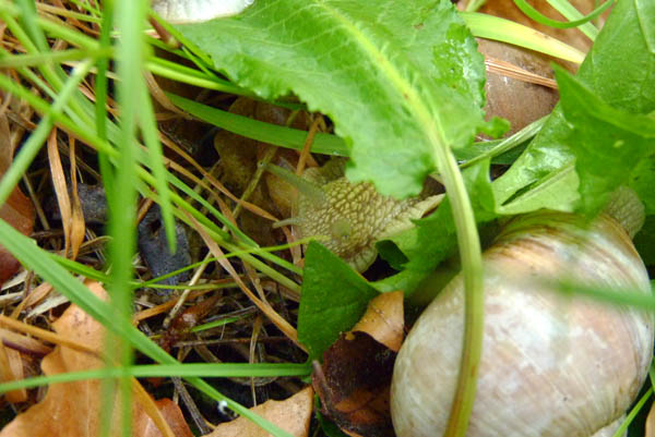 Frida war offensichtlich nun rollig und an einer Tour den kleinen Kerl am Befühlern und Beschmusen. Seine Reaktionen schwankten zwischen panischer Flucht auf den Beckenrand und willigem Herkriechen, Frida am Mantel knabbern usw. - v.a. wenn sie ihre Lockdrüse einschaltete. Teilweise mußte man befürchten, daß der deutlich kleinere Francois unter die Räder kommt. Da ich keine andere paarungswillige Weinbergeschnecke hatte und keine leihweise der Natur entnehmen wollte, hab einen Regentag ausgenutzt, sie eingepackt und zu einer buschigen größeren Fläche gefahren, wenige km Luftlinie vom alten Fundort.