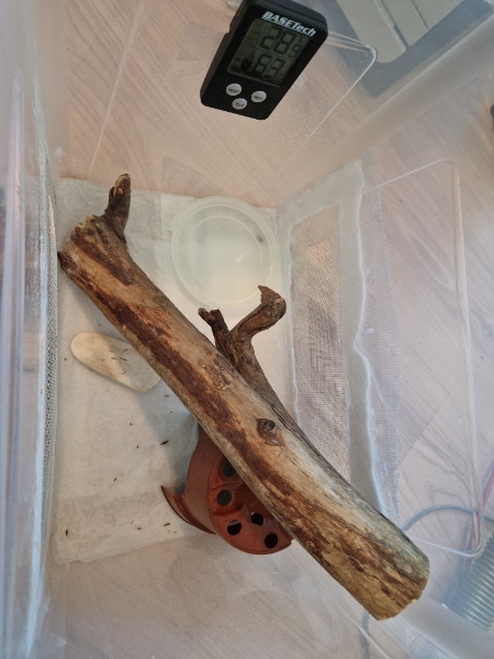 Ich hab ihn in ein Glas getan, da drinnen etwas Erde gepackt, eine Sepia-Schale hineingelegt, (nachdem die eierschalen nicht funktioniert haben) und ein Stofftuch darüber gespannt. Ein Termo/Hygrometer steht auch drinnen, damit ich die Temperatur und Luftfeuchtigkeit messen kann.