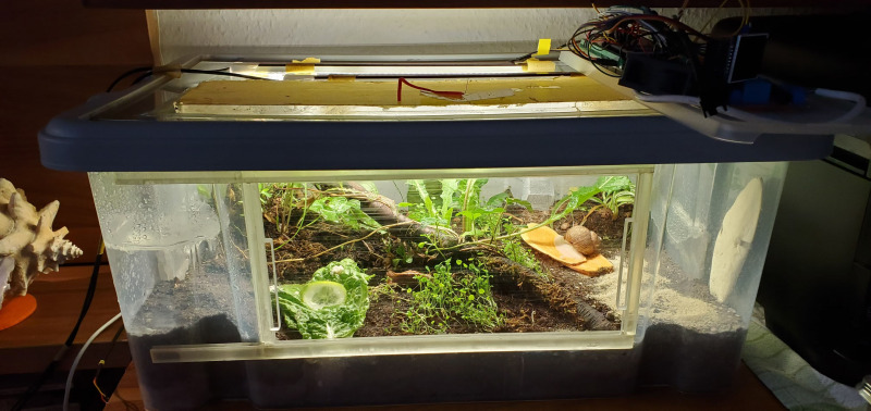 Heute gab es dann auch den ersten schönen Moment: Zwei meiner vier Schnecken (Helix pomatia) sind nach sieben Monaten Winterschlaf wieder aufgewacht und haben begonnen, ihre neue Umgebung zu erkunden.