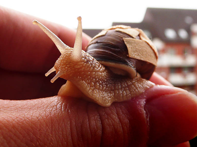Gefunden habe ich sie auf einem Feldweg, sie lag in einer Hufspur, ist wohl von einem Pferd angekickt worden und hat dabei etwa das vordere Drittel ihres Häuschens verloren. Als ich sie fand, lag sie relativ schlapp in ihren Scherben, und da sie keine größeren Weichteilverletzungen hatte, hab ich sie zum "Reparieren" mitgenommen. Kleinere, nicht mehr brauchbare Bruchstücke auf ihrem "inneren" Teil habe ich vorsichtig entfernt, das größere Teil ließ sich mit einer kleinen Überlappung gut anpassen und mit Steristrips befestigen. Es blieben zwei Löcher, die ich mit jeweils einem vorher ausgekochtem Schalenbruchstück einer "Spenderschnecke" (die lag in der Nähe, war aber schon tot) gedeckt habe. Das ging recht gut, indem auf ein passendes Stückchen Steristrip ein Bruchstück geklebt, und damit es sich besser der Form anpaßt, vor dem Befestigen mit einer Pinzette in kleinere Teile zerbröselt wurde. So kommen mit dem Schneckeninneren nur die Bruchstücke, nicht aber die Klebefläche des Pflasters in Kontakt.