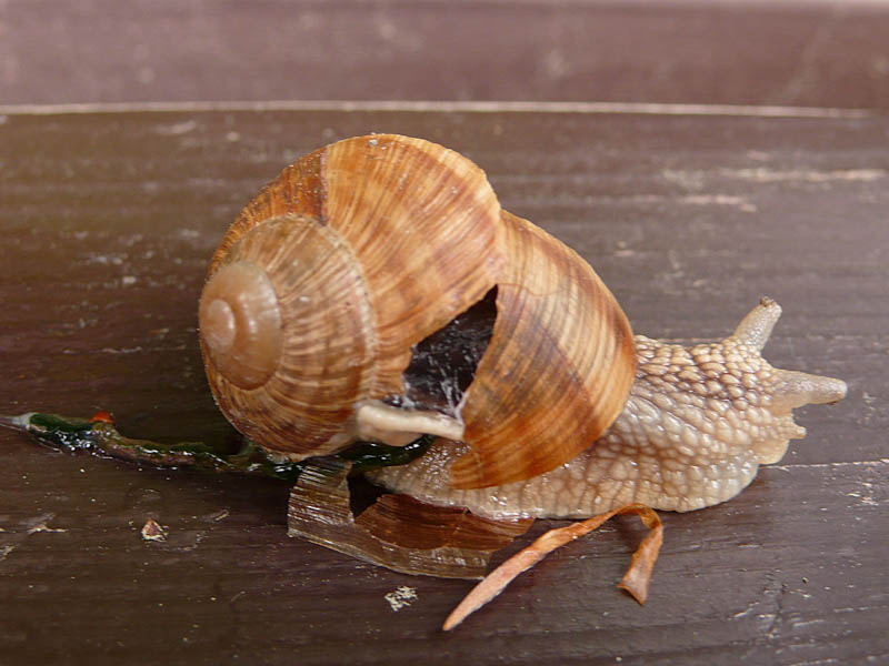 Die Schnecke dann in einen Kunststoffbehälter mit feuchten Zewas und ein paar Blättchen und einigen leckeren Dingen, die sie aber erst verschmähte. Erst am nächsten Tag war sie munterer und verdrückte eine erstaunlich großes Gurkenstück mit feingeriebener, ausgekochter Eierschale darauf. Das ist jetzt 6 Tage her, und obwohl sie eher unregelmäßig und sehr mäkelig ißt