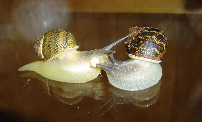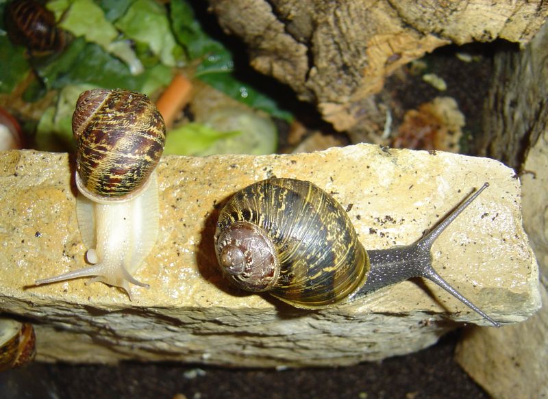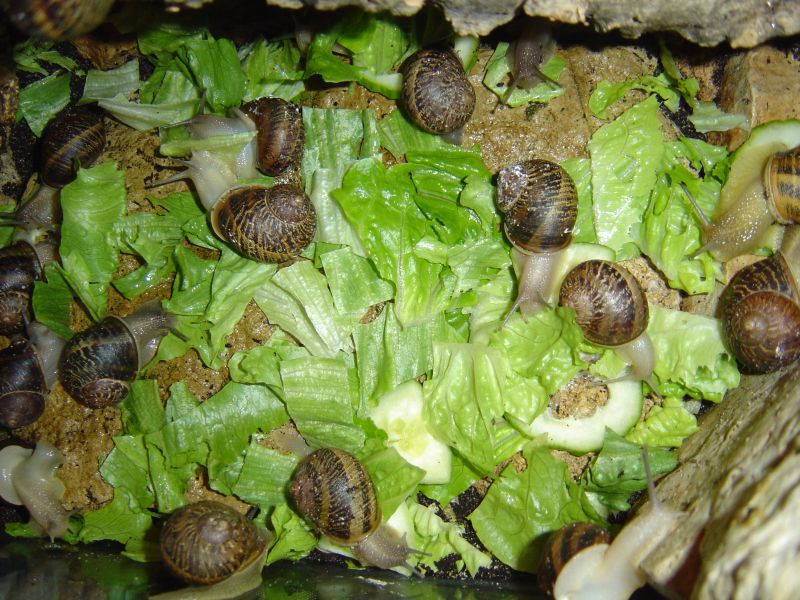 Wahrlich wild wird es allerdings bei Gabe von „Schnecken-Koks“ (abgeriebener Kalk) - da machen sie sich unglaublich drüber her. Auch über regelmäßigen Kalkbrei freut sich die Schnecke. Dazu werden z.B. Kalkpulver (geriebene Sepia-Schale), Banane, Mehl, geriebene Brotkrümel, Wasser zu einem zähen Brei gerührt.