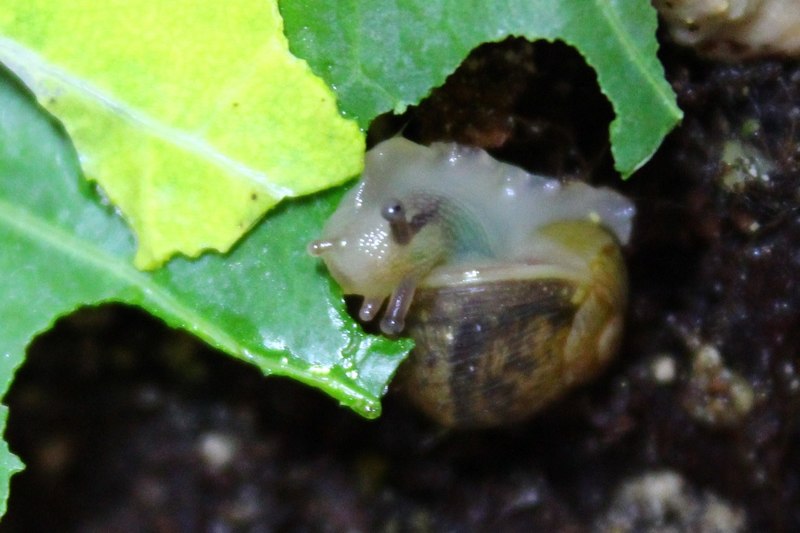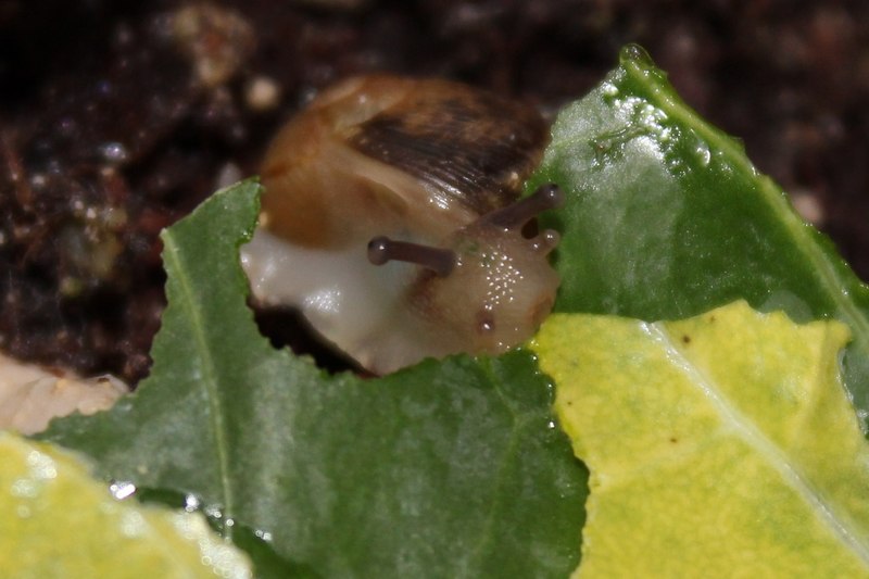 Außerdem lebt seit gestern bei ihnen eine winzige Babyschnecke, die ich im Elternbecken gesehen habe. Sie scheint allerdings ein Einzelkind zu sein, vermutlich habe ich ein Ei übersehen. Ich vermute, dass es keine Cornu sondern eine Eobania ist, sie ist wirklich sehr klein. Die Nacht hat sie fressend in einem Gurkenanschnitt verbracht. Wenn sie so weitermacht, wird bald so groß sein, dass man sich hinter die Artbestimmung machen kann.
