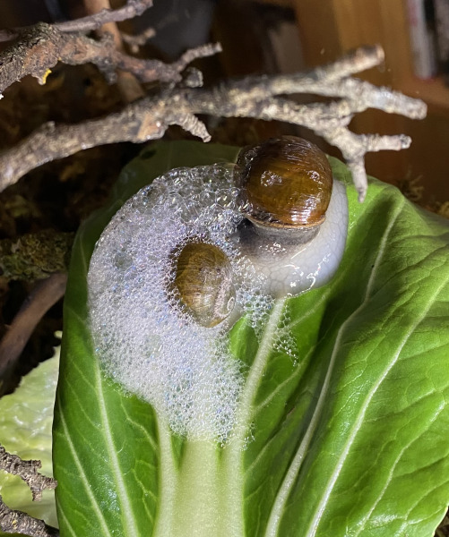 nun, ich habe bisher weder so eine grosse schaumglocke gesehen, noch ein derart andauerndes gegrunze beobachtet. und schon gar nicht so ein verhalten der anderen schnecke, die möglicherweise beruhigend gewirkt hat.
