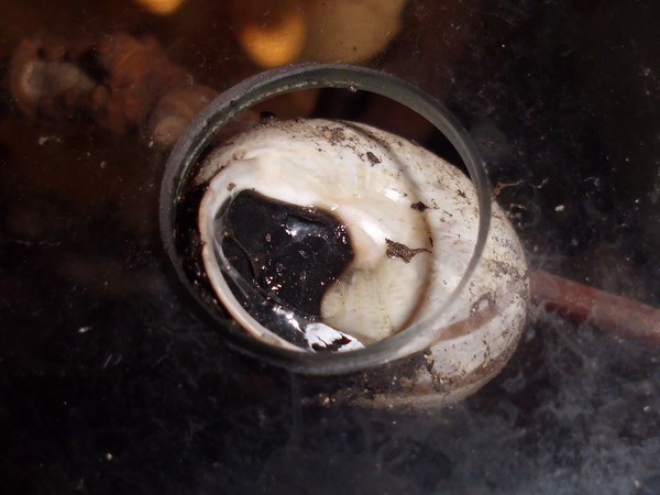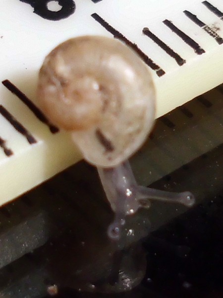 Da saß was unter einem der Träger, wo der Deckel aufliegt, und ich fragte mich: wie kommt eine Assel dort hin? Ich habe das runde Ding dann vorsichtig mit einem kleinen Löffel abgenommen und erstmal auf die Abdeckung gelegt. Hm, wirklich eine zusammengerollte Assel? Mit der Lupe betrachtet sah das doch eher nach einem kleinen Schneckenhaus aus. Ich habe dann erstmal abgewartet, und schließlich: