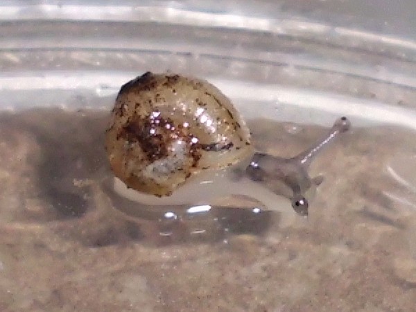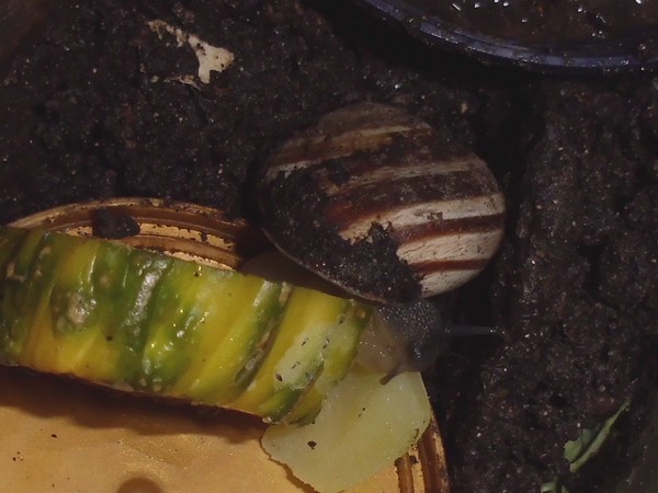 Das schüchterne Dingelchen ist dann in eine kleine Dose umgezogen, etwas feuchte Erde, Eierschale, Kletterzweiglein... Nach einiger Zeit kroch der kleine Schneck am Deckelchen, also umgedreht und noch mal Fototermin.