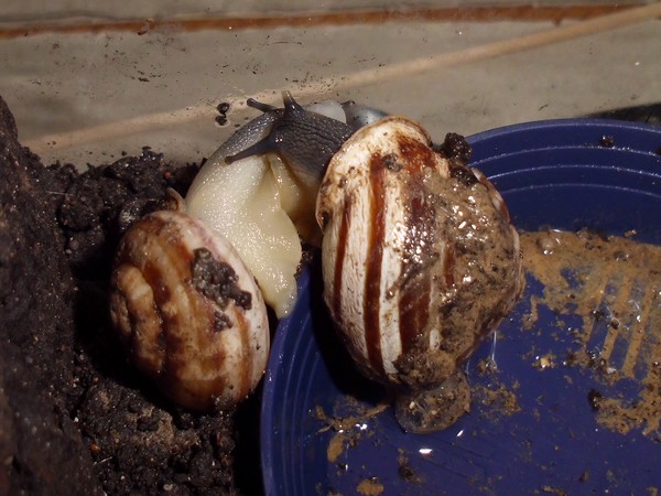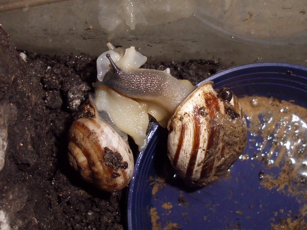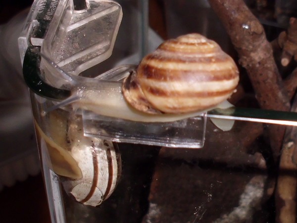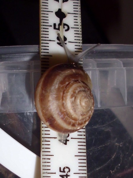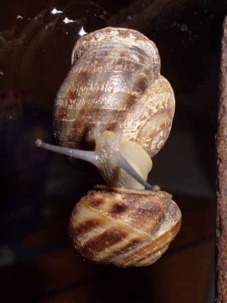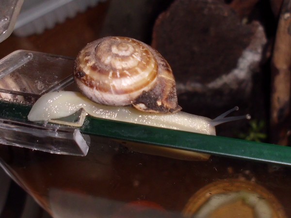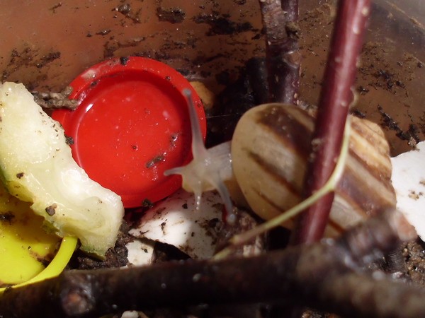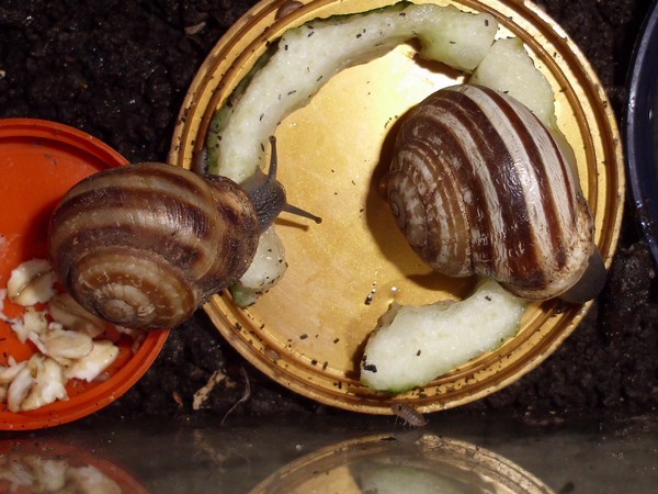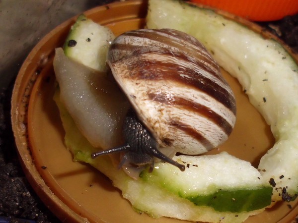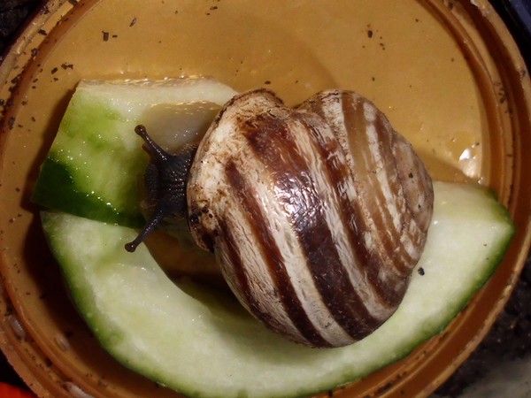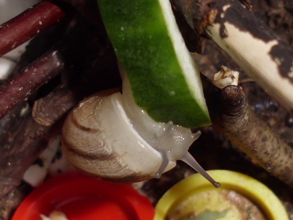 Letzte Nacht habe ich ihr einen halben Gurkenring spendiert. Die Kerne hatte ich entfernt, da das weiche Innere bei Gurken schneller verdirbt, und so ein kleiner Schneck futtert ja nicht gar so viel. Irgendwann hatte sie es jedenfalls entdeckt, und dann wurde die Gurke auch intensiv "bearbeitet".