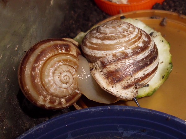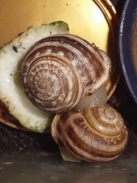 Hier kommen noch ein paar Bilder von Ende April. Bébé und Giovanni drängeln sich auf der Gurkenscheibe.