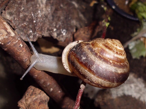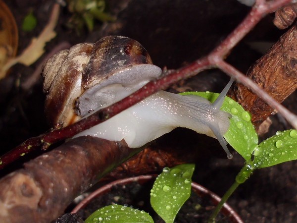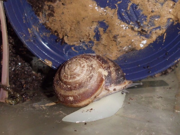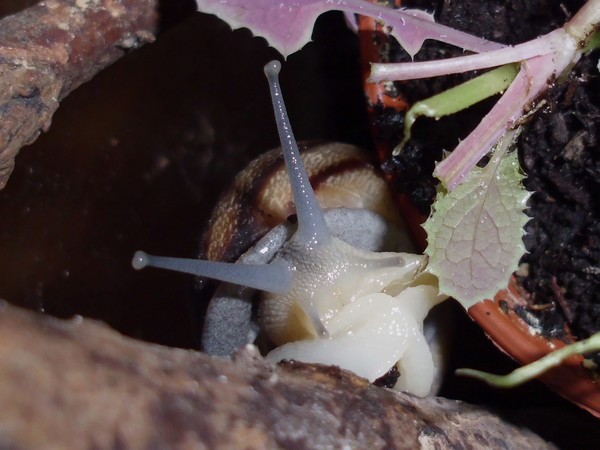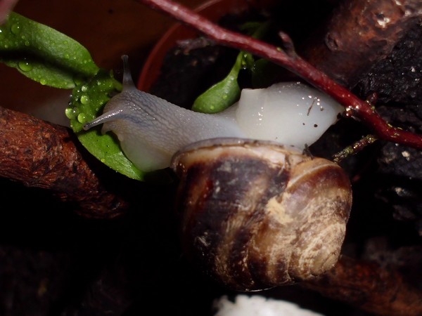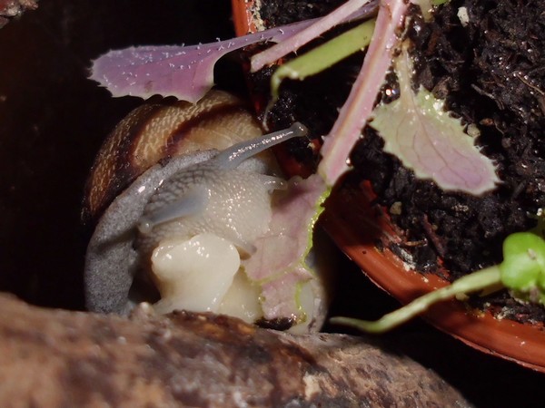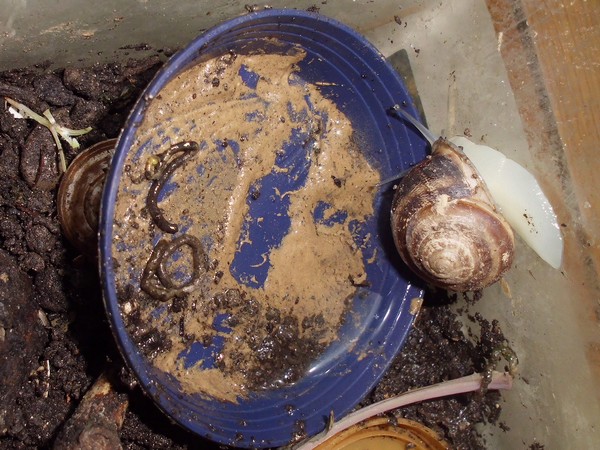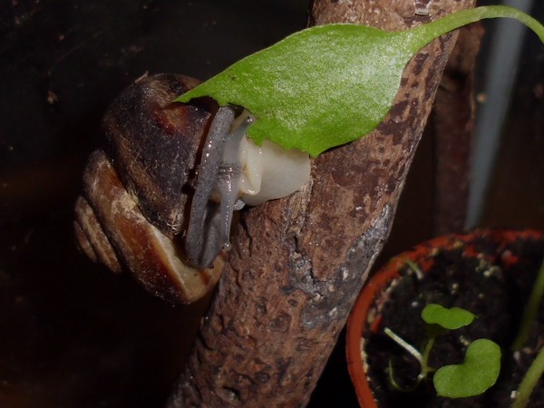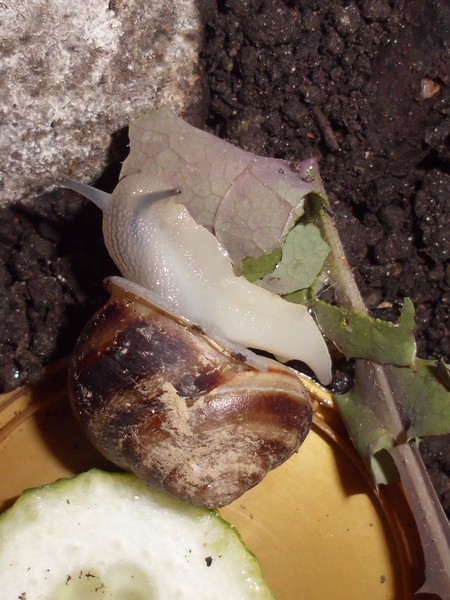 Samstagnachmittag habe ich den Schnecken von einem Spaziergang eine Löwenzahnblüte mitgebracht, bis ich zu Hause war, hatte sie sich natürlich ziemlich geschlossen. Irgendeine der Schnecken hatte die Blüte erstmal in die Badeschale geschubst. Später machte sich Bellina mit sichtlichem Genuss an der Blüte zu schaffen.
