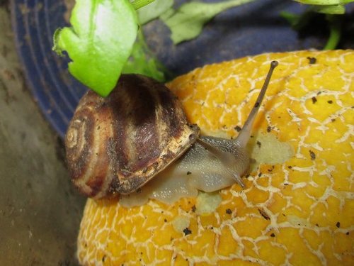 Vorige Woche habe ich das Terra mal so einigermaßen geputzt. Das Problem dabei war, dass die Schnecken alle an drei Wänden verteilt klebten und schliefen, also habe ich versucht, vorsichtig rumdrum zu wischen. Die Vorderseite war schneckenfrei, da konnte ich zumindest für mehr Durchblick sorgen. Aber natürlich wurden die anderen nach und nach wach... Am Ende war jedenfalls der Boden wieder gut angefeuchtet, die Kletterzweige neu angeordnet, Badeschale und Futterschüssel gefüllt und als Bonus ein Töpfchen mit Paprikapflänzchen reigestellt, das jetzt einige Wochen bei mir stand und gut gefüllt war.